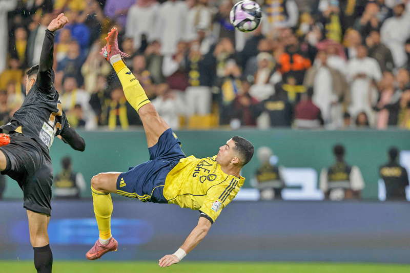 Ronaldo (kanan) melakukan sepakan basikal semasa menjaringkan gol keempat pasukannya di Al-Awwal...