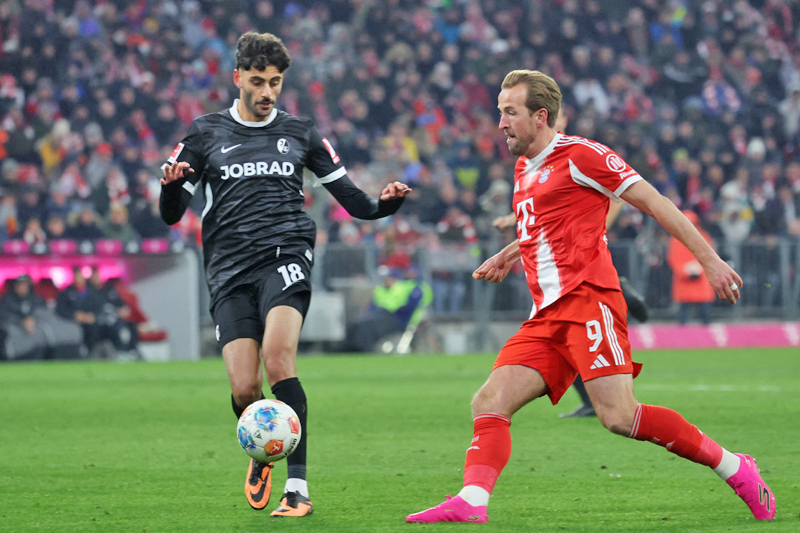 Kane (kanan) dan Eren Dinkci bersaing mendapatkan bola semasa perlawanan bola sepak di Munich,...