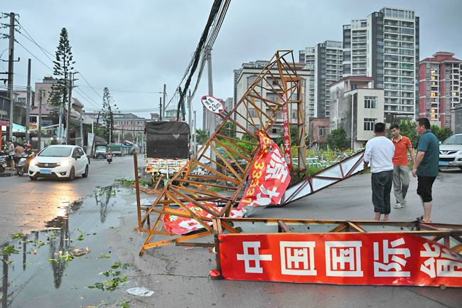 People remove a fallen iron gate after the passing of Typhoon Ragasa in Yangjiang, southern...